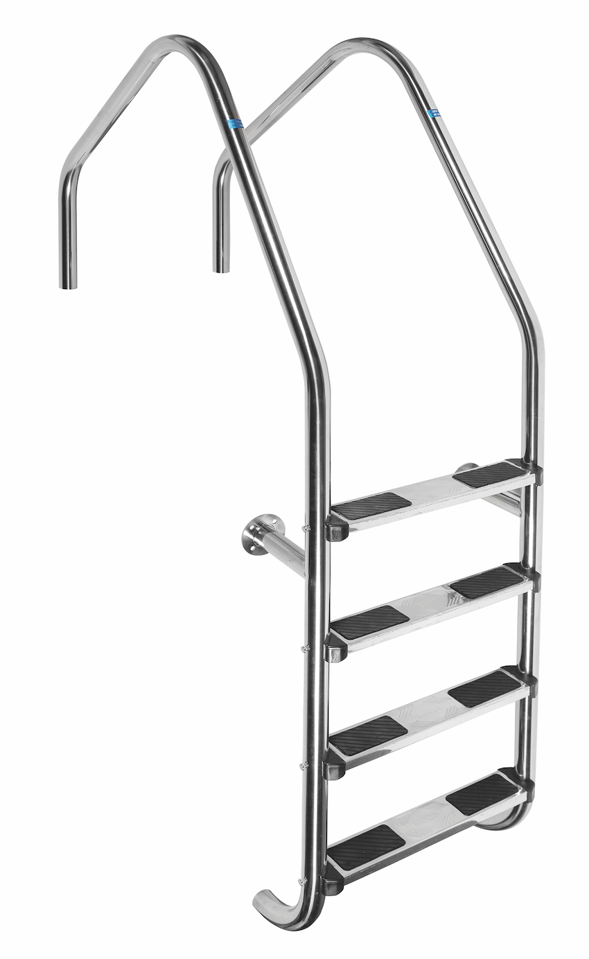 Лестница для бассейна Gemas Overflow из полированной нержавеющей стали марки AISI-316 на 4 ступени с противоскользящими накладками черного цвета для безопасного и удобного спуска и выхода из воды в общественных бассейнах. Подходит также для бассейнов с переливной системой. Предназначена для удобного спуска и выхода из воды. Лестница монтируется в верхней части бассейна при помощи закладных стаканов с накладками из нержавеющей стали. Имеет дополнительное фланцевое крепление на уровне первой ступеньки. Нижняя часть лестницы упирается в стену бассейна резиновыми заглушками. Крепеж не нарушает гидроизоляцию чаши бассейна.